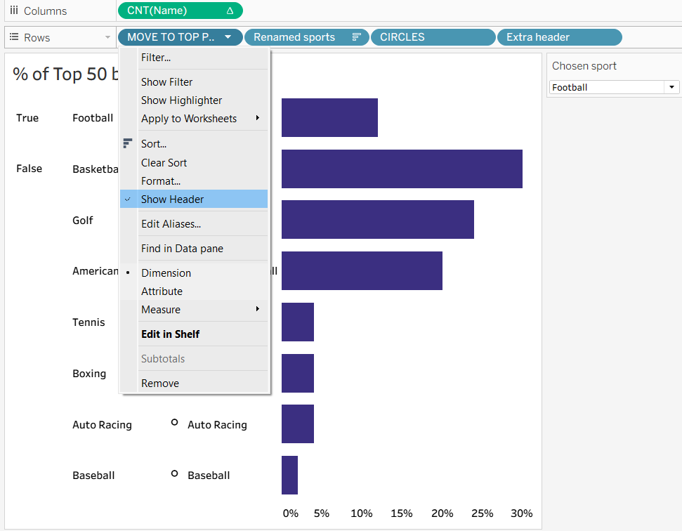 Step 6: Hide the extra headers. To format the chart without the True/False etc, you'll need to deselect show header in the dropdown of your move to top measure and your original category field. This will leave you with just your circles and your extra header field showing in the chart.