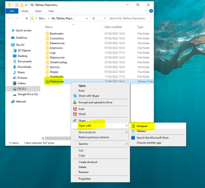 First off, navigate to your Tableau Repository, right click on 'Preferences' and select 'Open with', 'Notepad':
