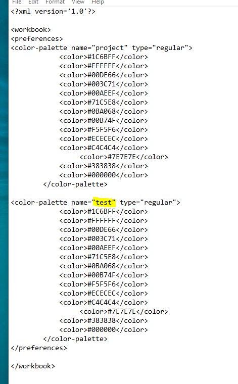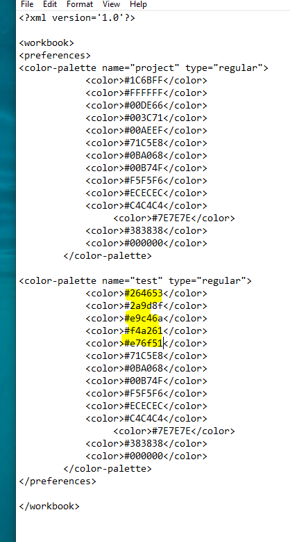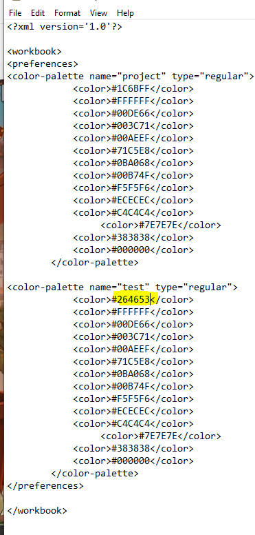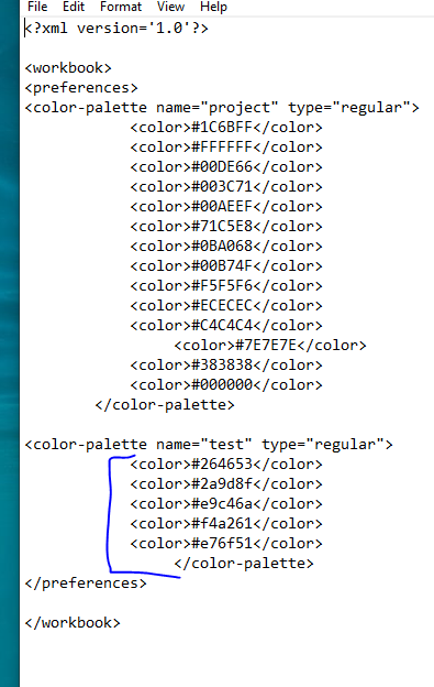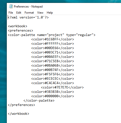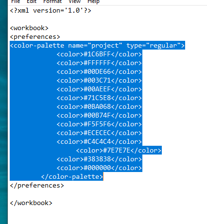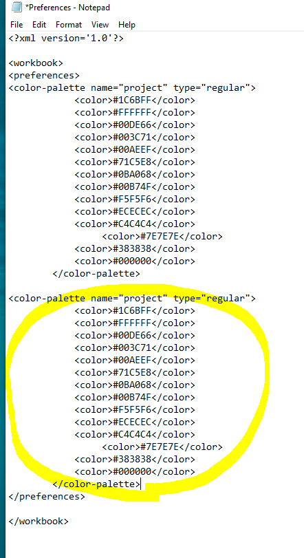 The quickest way to do this is copy and paste the existing color palette. So we want to copy everything in-between '<preferences>' and '</preferences>':
