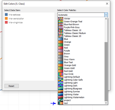 Open up a fresh Tableau page and you will now see the 'test' color palette listed: