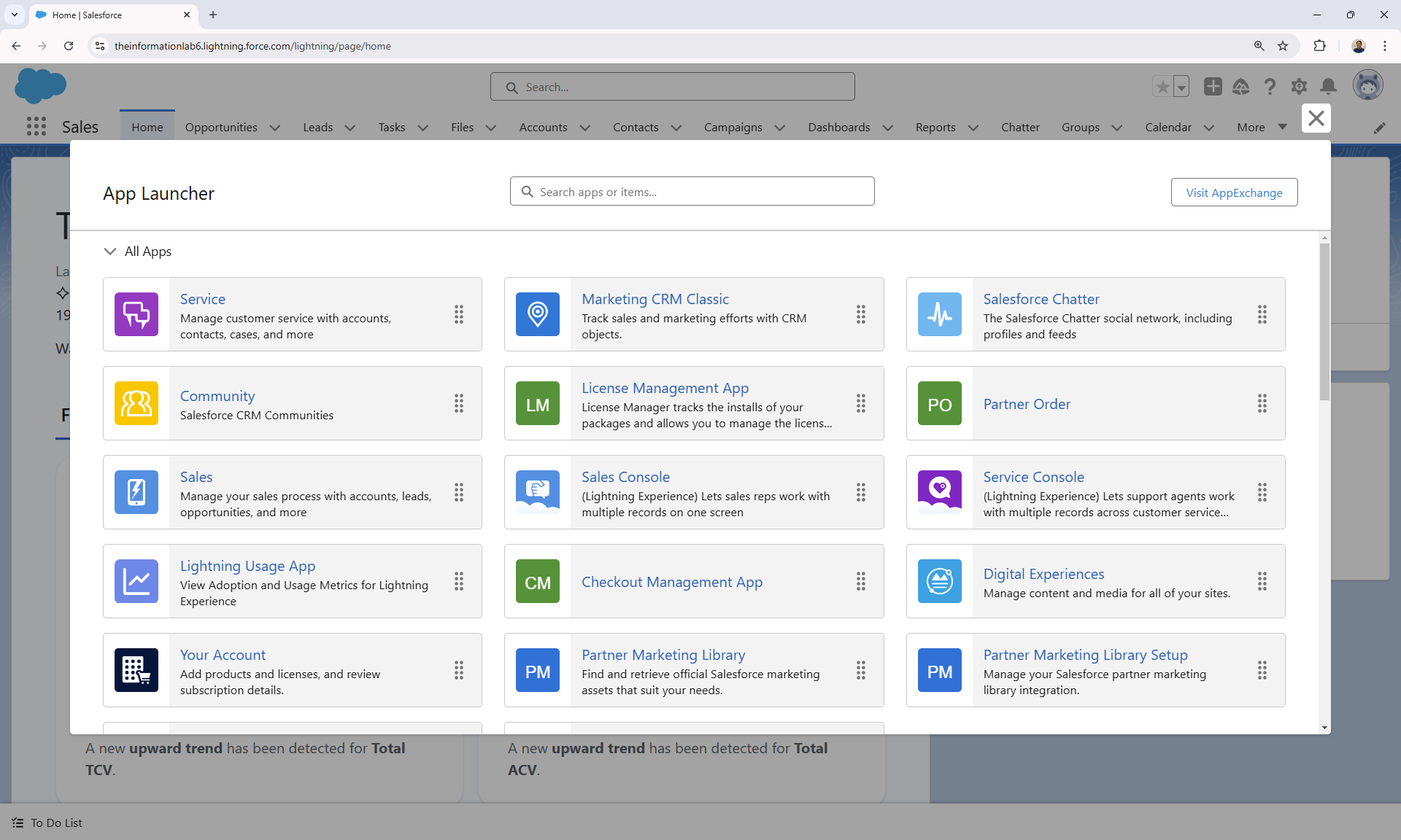 Note: Your profile determines which apps you can view and build. For this tutorial, you will need an admin access in Salesforce and Tableau Cloud.