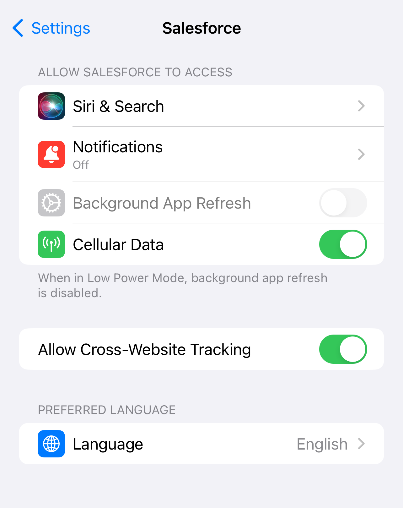 After downloading the Salesforce App, go to your device settings. You will need to Allow Cross-Website Tracking.