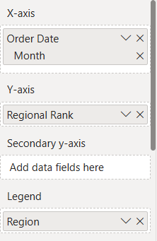 We will then drag order date onto the x-axis; our created calculation, regional rank, on to the y axis and region on to the legend.