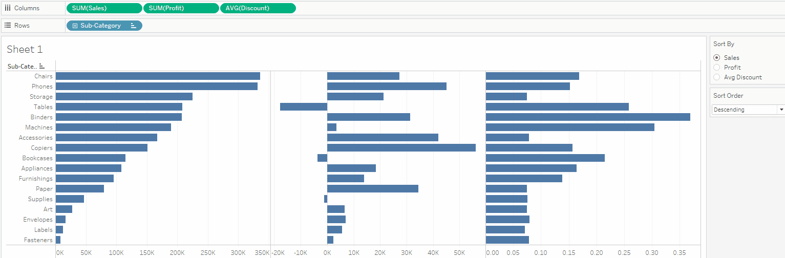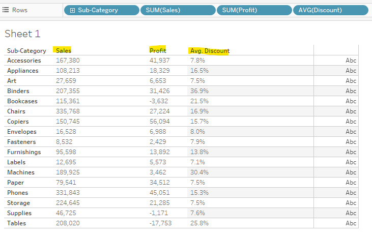 In this blog, I use the Sample-Superstore dataset in Tableau. I drag the Sub-Category into Rows and the sum of sales, profit, and average discount into Rows. Make sure all pills are discrete. (Image 1)