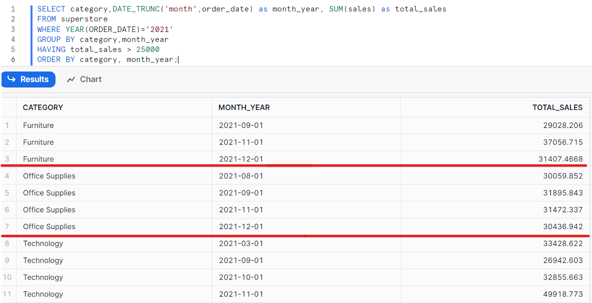 SELECT category,DATE_TRUNC('month',order_date) as month_year, SUM(sales) as total_sales