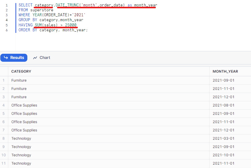 Therefore, in the SELECT clause, I will put the highest level at the beginning and the lowest level at the end. I used the DATE_TRUNC function to return the first day of each month and year instead of splitting one column for each month and another one for the year. For calculating the total sales value by each month and category, I need to use the "SUM" function.