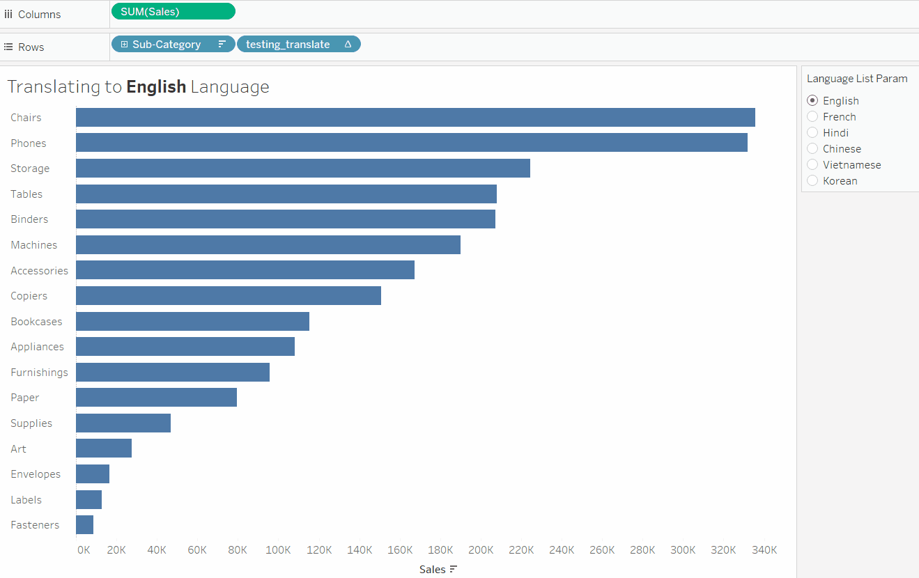 Now, drag it next to the Sub-Category field in Rows. Show the parameter and also change the title to let you know the language you are choosing.