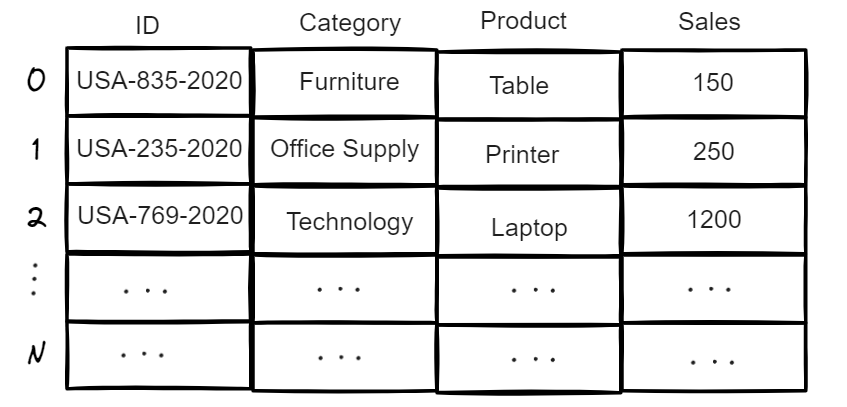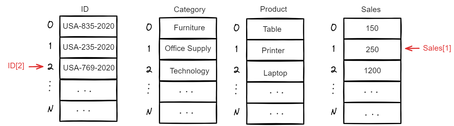 If I split each column separately, it would look like Image 2 below. Each cell has its own identification. For example: If I want to know which ID is on the third row, I will call ID[2]. Then, the system will understand that ID[2] = USA-769-2020. Or Sales[1] =250.