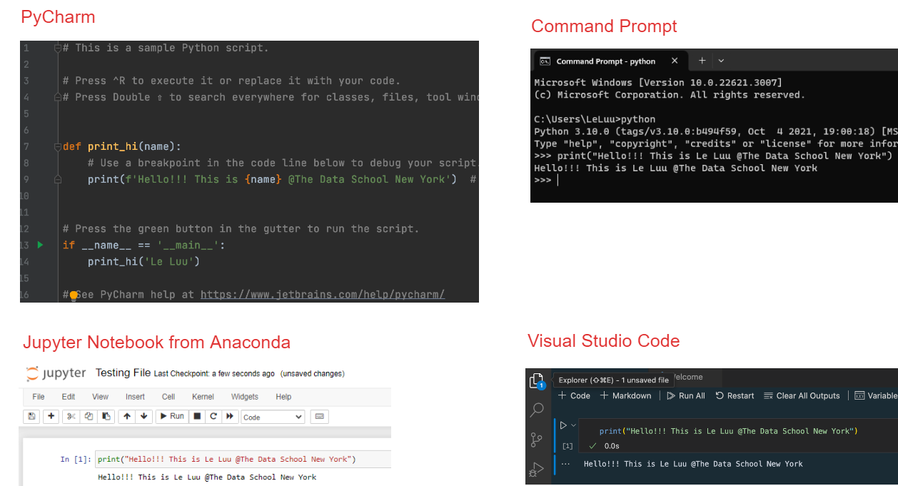 After understanding the data type for the input and output from the Python functions, I will share about writing Python functions. Any IDE (Integrated Development Environment) can write and save Python functions. Many IDEs that I used: PyCharm, Jupyter Notebook from Anaconda, Command Prompt, and Visual Studio Code (Image 3). Each IDE has pros and cons. For me, I usually use Jupyter Notebook from Anaconda.