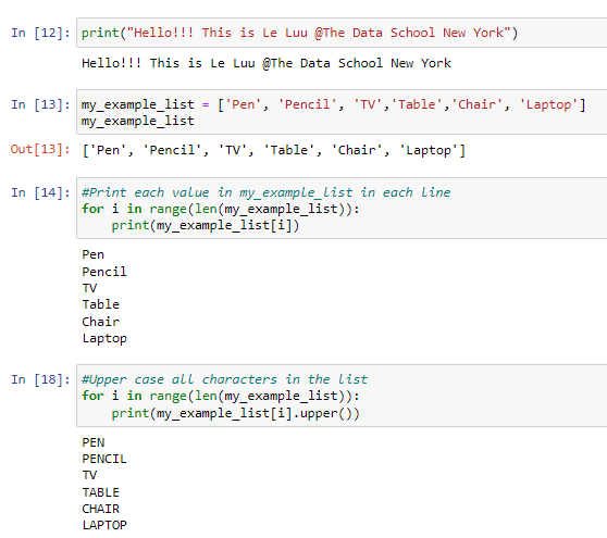 In the cell In[14], I wrote a for loop to iterate each element inside the my_example_list and printed out each element in that list in a new line. In cell In[18], I also wrote a for-loop to iterate each element inside the my_example_list. However, at this time, for each element [i] in the list, I want to uppercase all characters of each element. In this case, I used the upper() function.