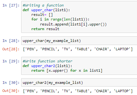 To start writing a function, I need the keyword "def" to let Python know that we are defining a function. For example, In cell In[23], I wrote a function upper_char: