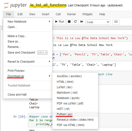 In Jupyter Notebook, I edited the name of the file. In Image 7, I named my file le_list_all_functions. Then, I go to File > Download as > Python (.py).