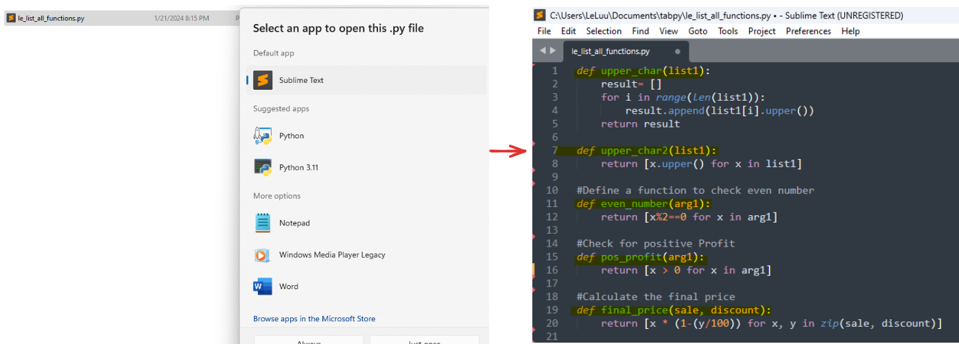 After downloading the Python file (.py), I right-click on the file and choose Open With. You can choose any Text Editor to open. On my computer, I open it by Sublime Text. After you open the file, edit the file to make sure only the function is in the Python file. I deleted all sample data (Image 8). Then, Ctrl+S to save the file.