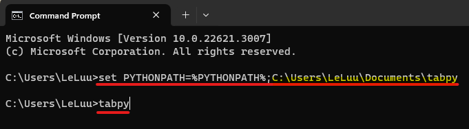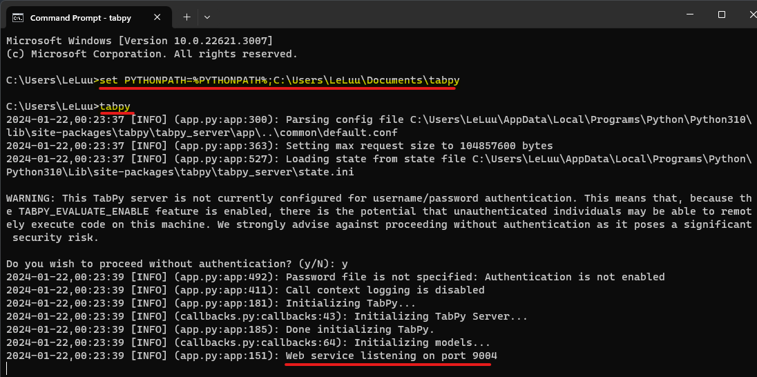 In my case, <my-python-functions-folder> is C:\Users\LeLuu\Documents\tabpy. Then press Enter. In the new command line, I type tabpy and enter (Image 9); then press y.