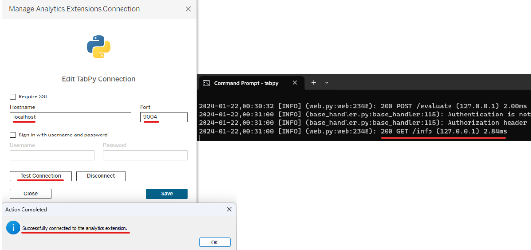 I used Sample SuperStore in Tableau to demo. Before creating a new Calculated Field, let's check the connection from Tableau to TabPy first. In Tableau Desktop, go to Help > Setting and Performance > Manage Analytics Extension Connection... Then, make sure the Hostname and Port are correct. Click on Test Connection. If you see the Action Completed Pop-up and 200 GET code in the Command Prompt, then you successfully connected to TabPy from Tableau (Image 11).