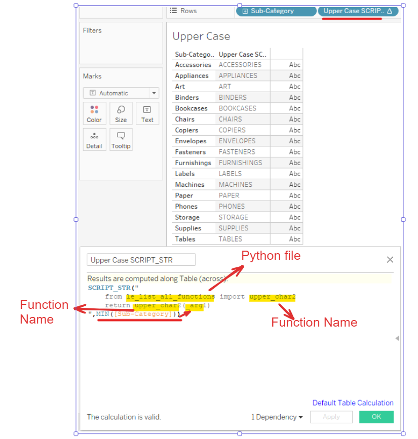 - SCRIPT_STR: to demo this function, I will use the upper_char2(list1) function in my le_list_all_functions. I created a new Calculated Field called Upper Case SCRIPT_STR. Then, I type the same as Image 12. Note that, Tableau required the argument in the Aggregation function, so I put Sub-Category in Min function. Also, make sure the indentation when typing Python code and make sure the Python file and function name are correct.