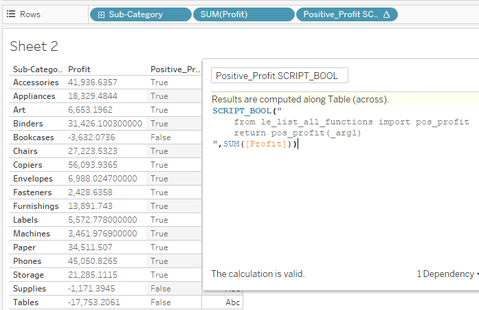 - SCRIPT_BOOL: I want to check which sub-categories have positive profit and return Boolean type, so I called the pos_profit function (Image 13).
