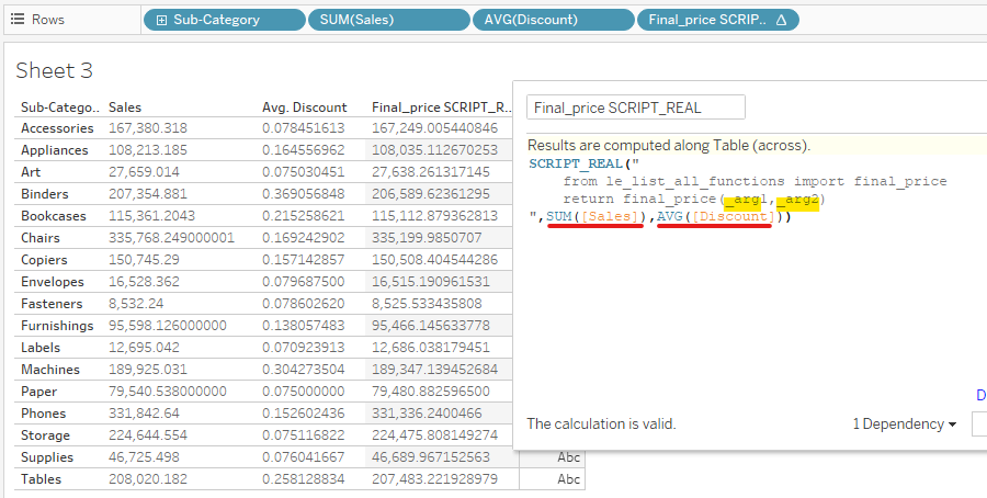 - SCRIPT_REAL: I want to calculate the final price of each sub-category after the discount and return a Real data type result, so I called the final_price function with SCRIPT_REAL (Image 14). You should be careful to put the argument in the order same as the order in the Python file.