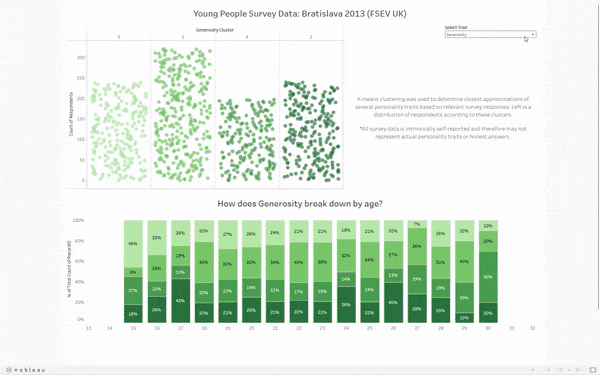 The bottom displays the breakdown by age for each cluster. The color convention carries over - those with the most of the selected trait are on the bottom. If you'd like to explore this breakdown for yourself, feel free to check out my work on tableau public here. If I have time after training, I'll definitely come back to this dashboard to include that which I wasn't able to previously.