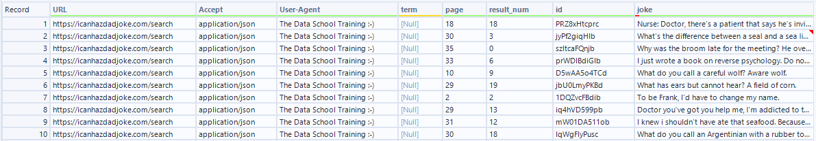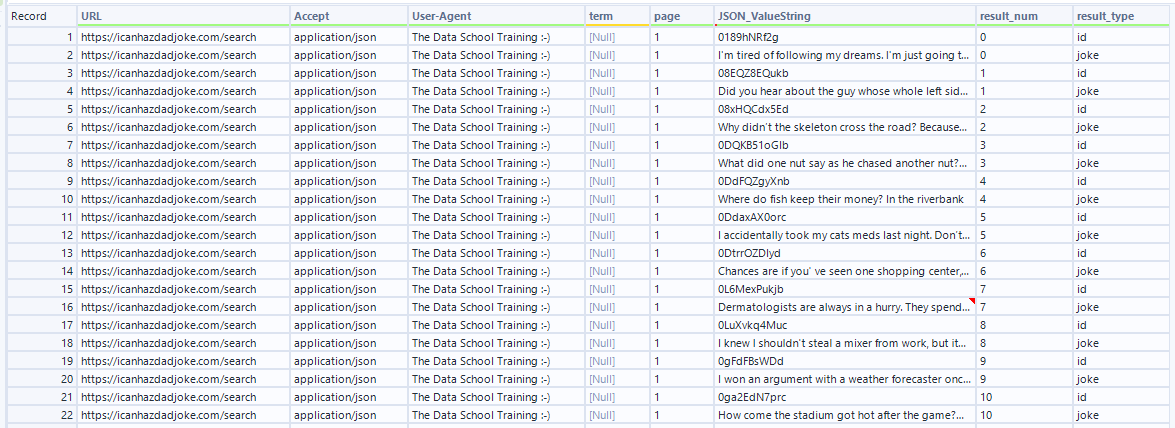 Using cross tab here helps us take the different row types (id row or joke row) and turn them into columns to associate relevant values to the same row. We take each distinct result_type and make it a column of its own, and fill in the values for the column from our JSON_ValueString. We make sure to group by the result number and page so that, for example, all relevant rows from page 1 result 1 gets placed together, and page 2 result 1 rows get placed together.