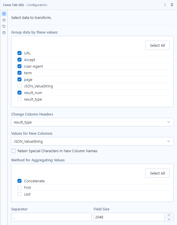 There are cases in reshaping your table where multiple data points get sorted into the same cell. In this situation, Alteryx asks for a way to combine these values. The tool will not run until this option is configured. Even if you anticipate not having this occur.