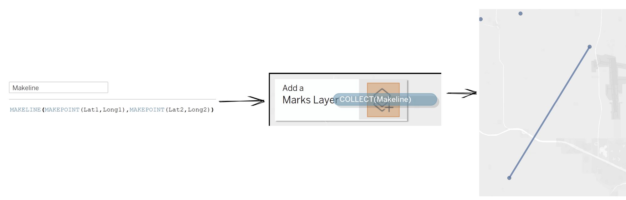 Building on from makepoint, this function simply generates a line mark between two points. It can be used for creating origin-destination maps. Create the calculated field using the syntax below, replacing with your own coordinates for the points and drag it to to the marks layer. It should then show similar as to the figure on the right.