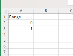 Before we started, we also needed to create a new table in Excel or Google Sheets, where we write names – Range and numbers 0 and 1. You can see it below in the screenshot.