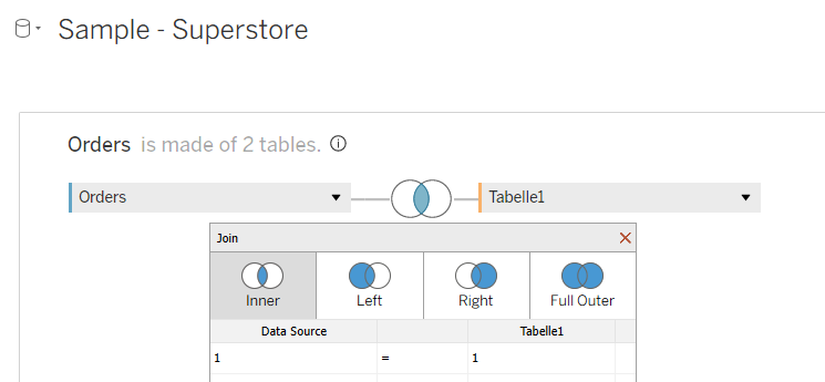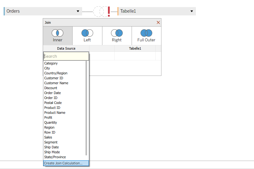 After that, we open our Tableau and add our first table – Superstore. Then you double-click on this table, and one window for relationships opens. We need to do an inner join with the newly created table Range. We click first on “Add new join clause” and choose “Create Join Calculation”, and write 1. After that, we need to do the same on the other side. After that, we have our join, and it means that our data is doubled. One field with range 0 and one field with range 1. This step is needed to create data densification between the points.