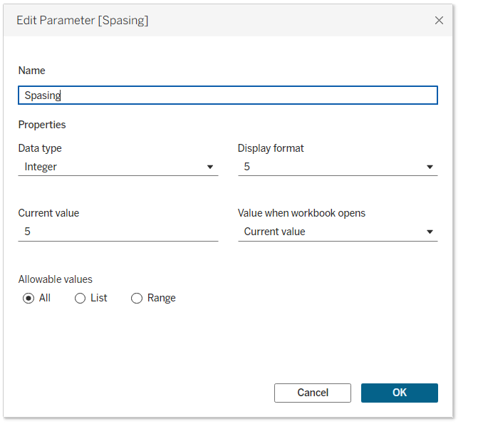 The first parameter will be called spacing and will be used to create space between different bars on the spiral. Data type I will choose integer, and for the current value you can use any value. In my case it will be 5.