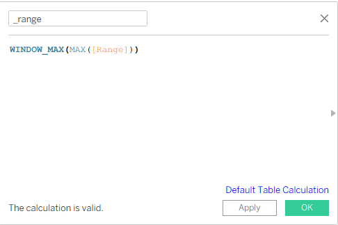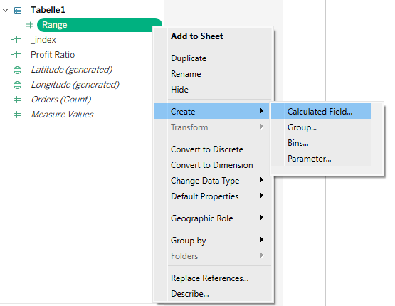 The second calculation will be for _range. You can click to create a new calculation, or you can click on the field Range in the data pane, right-click, and choose Calculated Field.