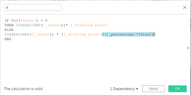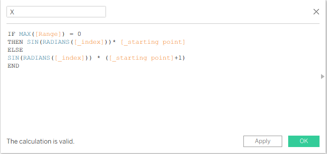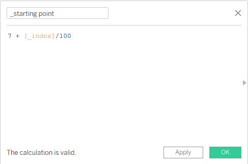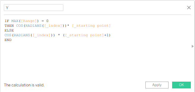 After that, we create a new calculation which will be the _starting point. We create this calculation because we don’t want to start our chart from 0,0 on the X and Y coordinates. We want to start from 7, but you can start with any number you want. It means that for every point we are adding a fraction as we increase every point in the spiral path.