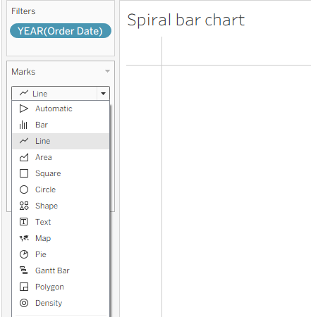 We drag Order Date to Filters and select all years you want to see on your dashboard. In my case, I will choose all of them. After that, we change the Marks card from Automatic to Line.