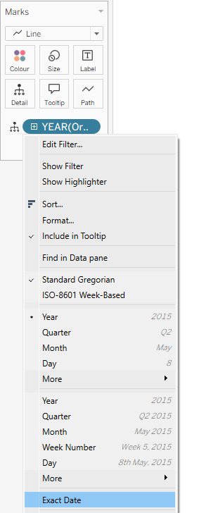 After that, we drag Order Date to Detail on the Marks card and choose Exact Date.