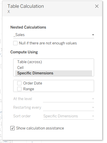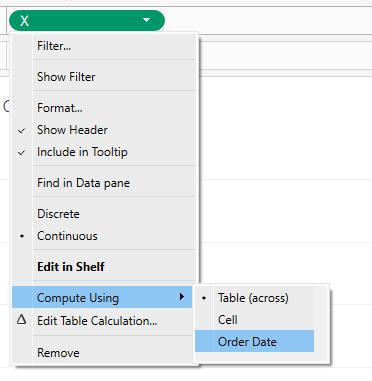 Earlier we set our X and Y axes to Compute Using – Order Date. Now we need to go to the X axis, click on Quick Table Calculation, select _Sales, and uncheck Order Date.