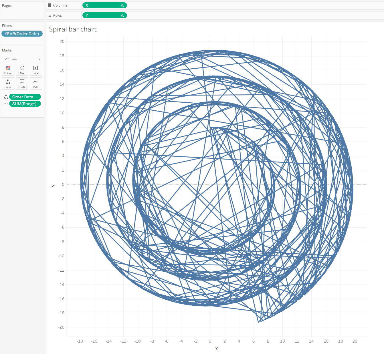 After that, we drag the X calculation to Columns and the Y calculation to Rows, and change Compute Using to Order Date for both axes.