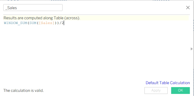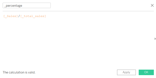 After creating the _Sales calculation, we can duplicate it, and it will be for _Total Sales. It is the same calculation, nothing changes. Next calculation will be _percentage.