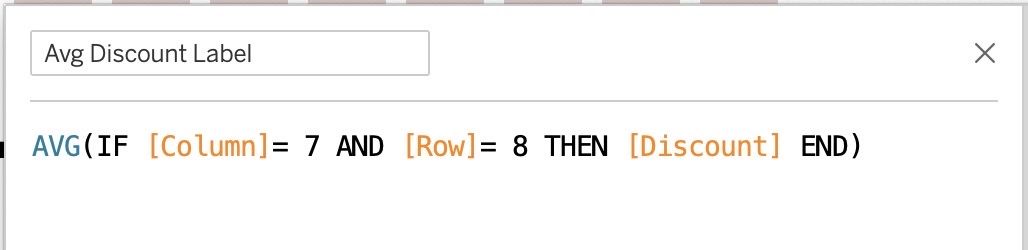 Now all that's left is to format the chart. This part is subjective and is completely up to you, however, I usually aim to hide all of the gridlines, headers, and axis, and then add a label to the chart, keeping the view clean, but informative. The label just requires one more calculation, visible in the image below, which basically just fixes the label to the point in the chart, where the column is '7' and the row is '8'.