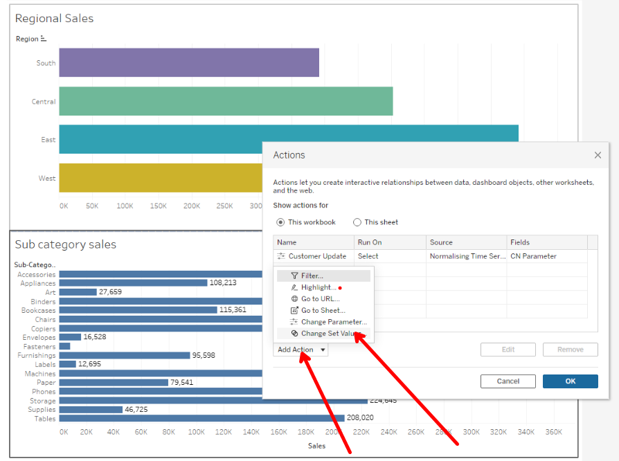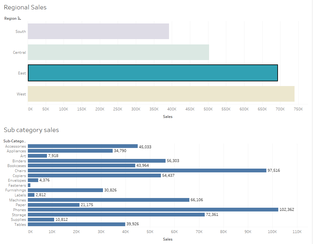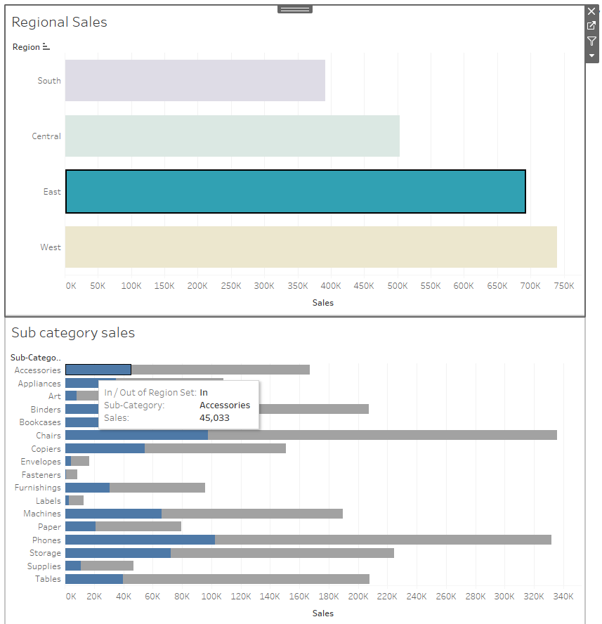 With Proportional brushing however, if I filter to the east, I will have the opportunity to see the sales amount per subcategory while I also see the sales amount of the other regions. This can be done using set actions.