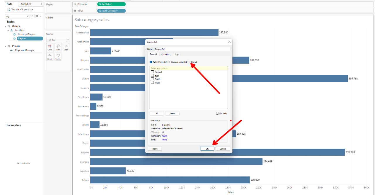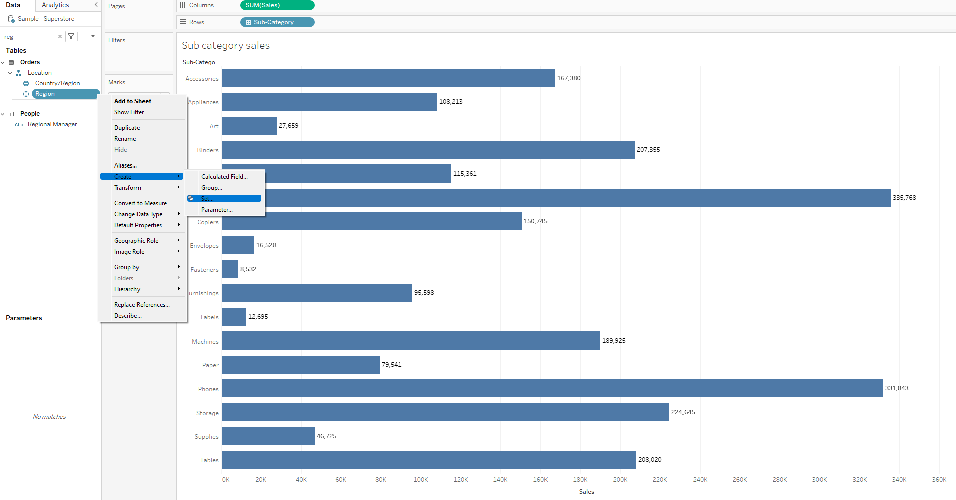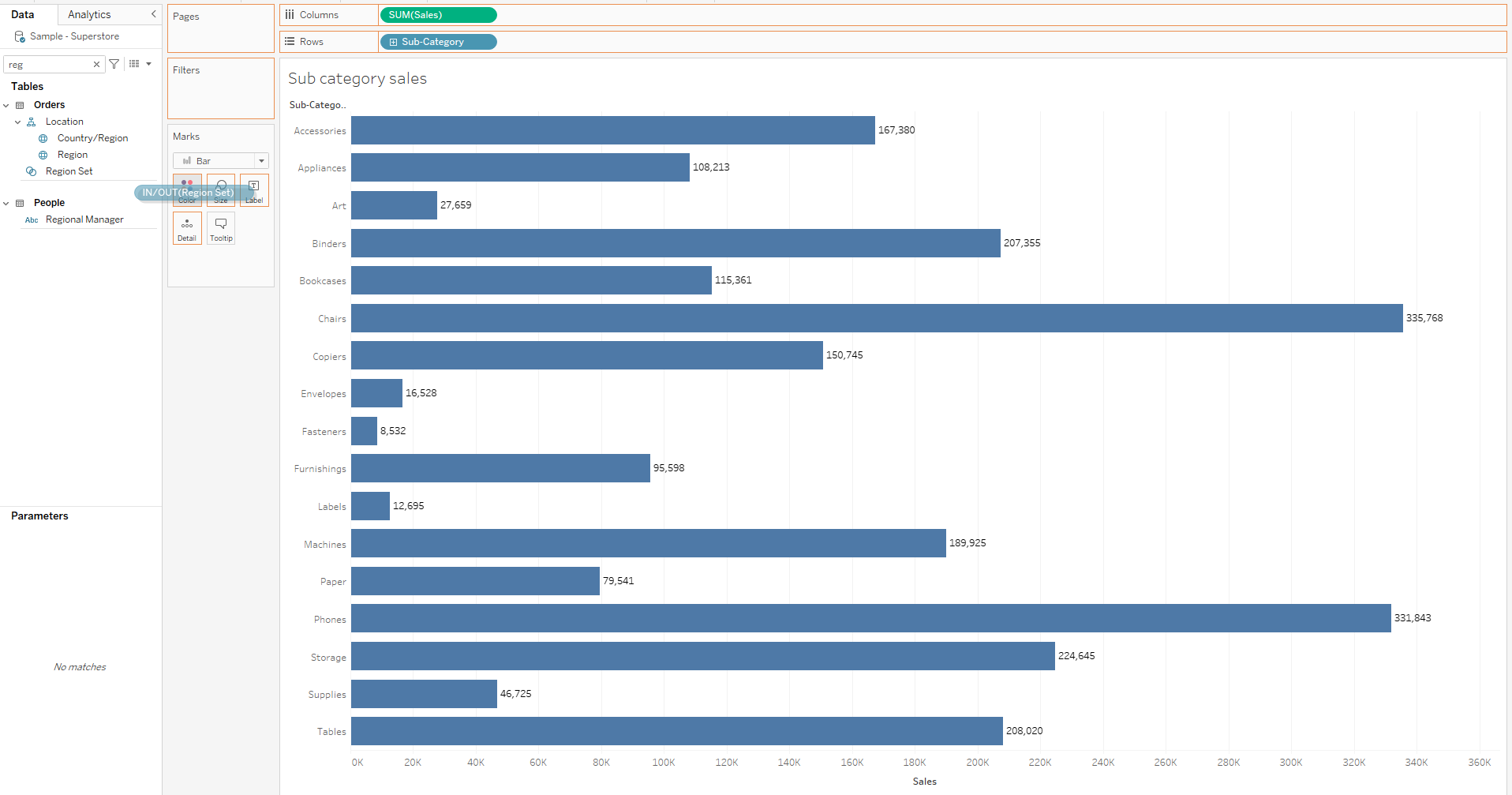 - After creating your sales bar charts per sub-category and region, you will need to create a region set using all fields.