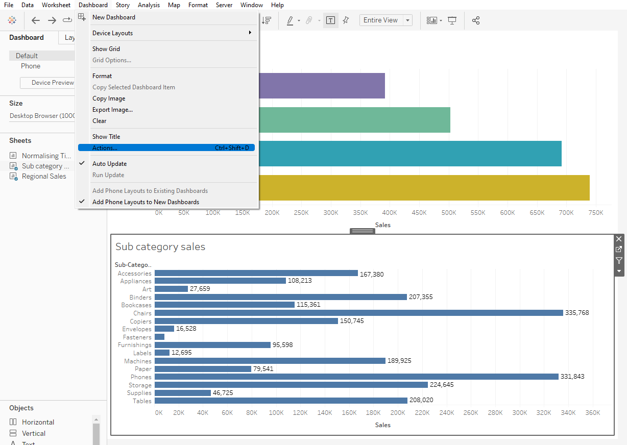 3. After dragging in both sheets created unto our dashboard, we can now create a dashboard set action which will aid in proportional brushing. Click on dashboard and select actions to bring up another window.