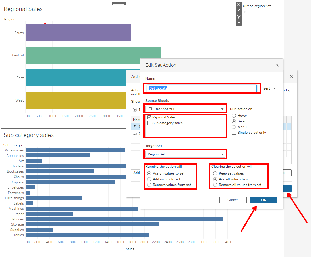 5. In the new window, give the action a name, select the dashboard name and the sheet which is being used as a filter in this case region sales, select the target set as Region set (the set we created earlier on), assign values to set and all values to set when selection is cleared. click ok and click ok on the original window.