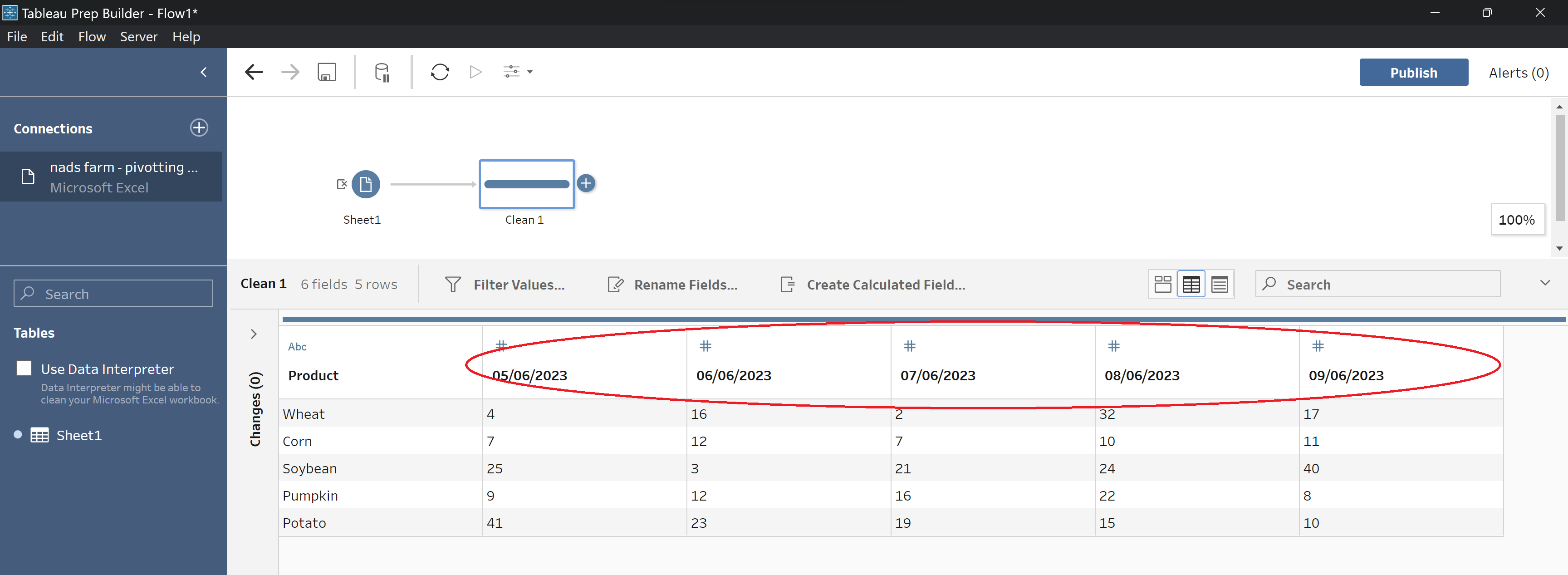Step 1: Load your data into Tableau Prep and add a clean step to view the data and identify the rows that need to be pivoted.