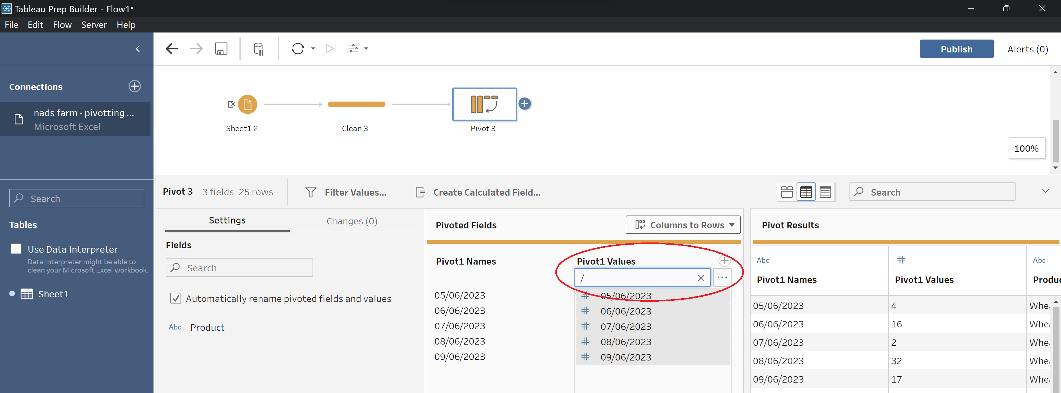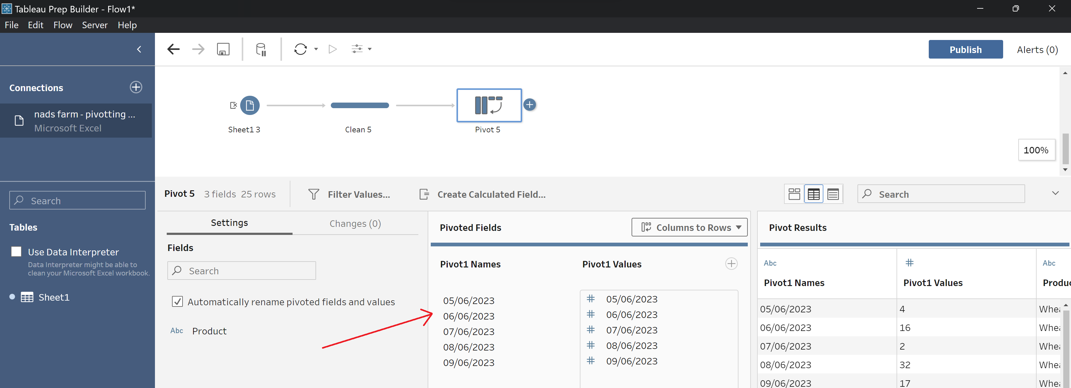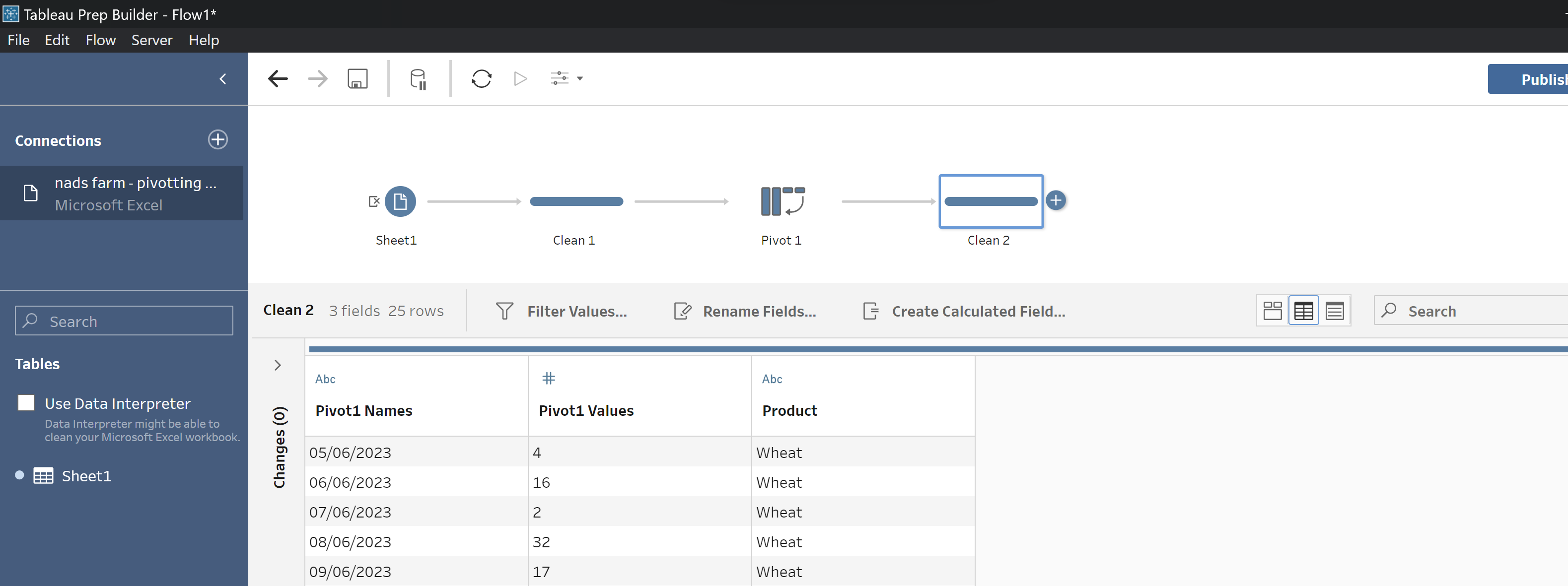 Step 3: Add a new Clean step to your workflow to view your pivot. Rename default column headings to match your data by double clicking on the headings or right clicking with your mouse and selecting 'Rename fields'.