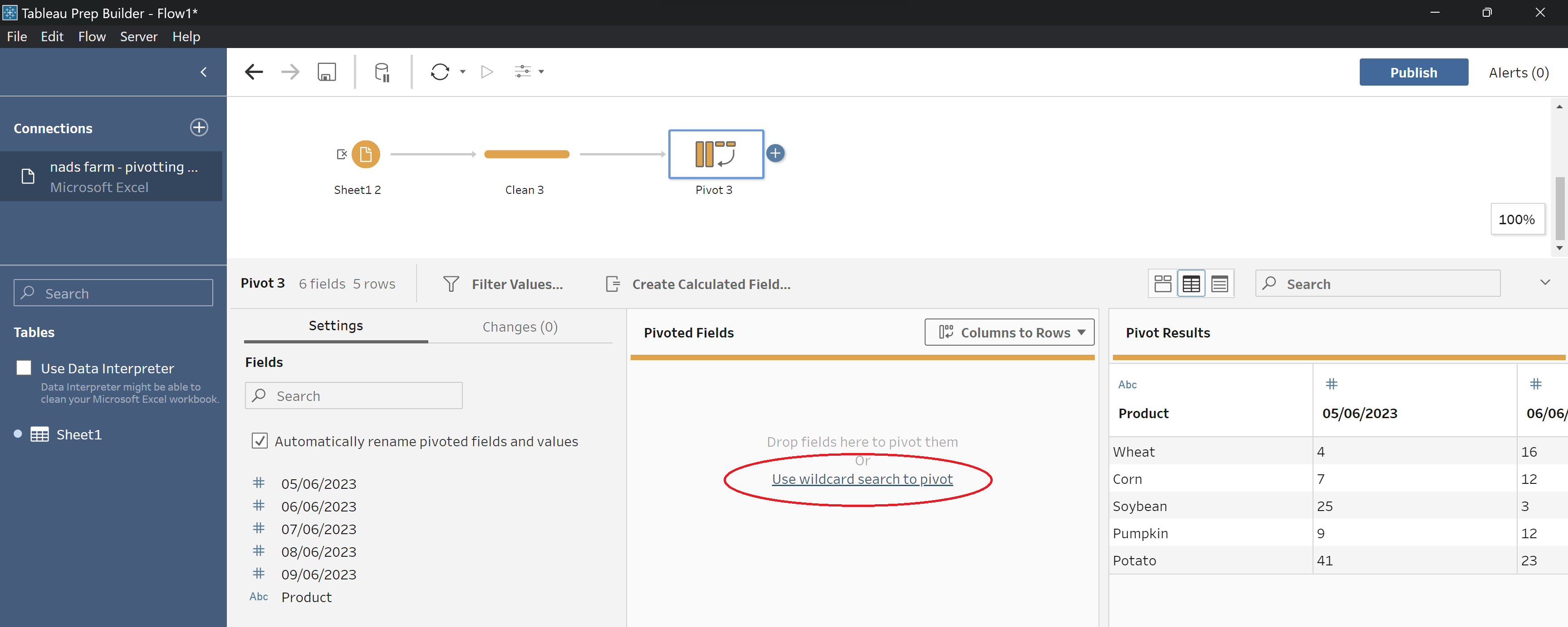 Step 1: Once you've added your pivot step to your workflow and ensured that your drop down is set to columns to rows, select 'Use wildcard search to pivot'.