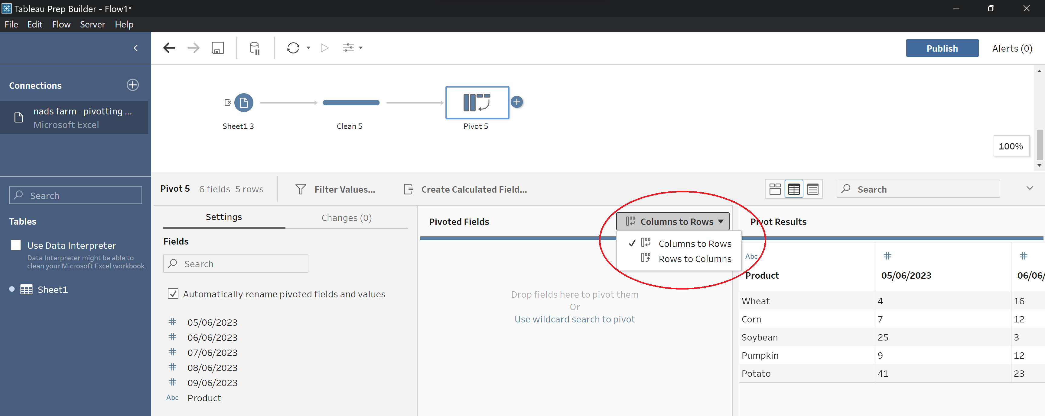 Changing columns to rows in Tableau Prep is necessary when you want to reshape your data from a wide format (where multiple columns represent different variables/metrics such as dates, or product type) to a long and narrow format (with a single column for the variables e.g. date, product type) and another column for their corresponding values).