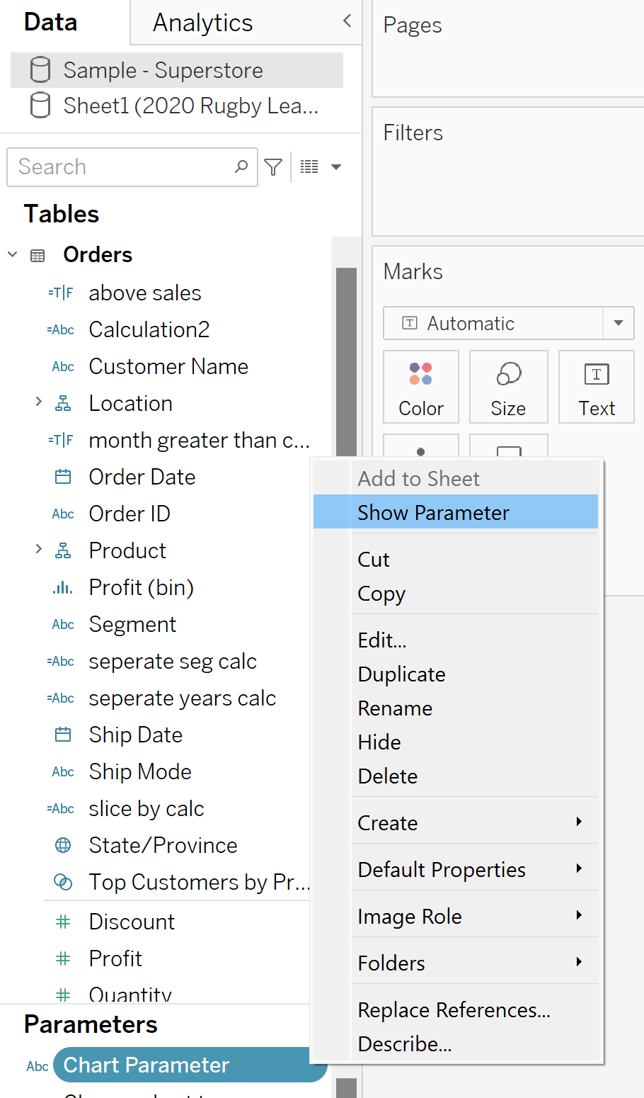 - Create a calculated field from the same Data Pane drop down arrow, name it something relevant (maybe Chart Parameter Calculated Field) and simply enter your parameter name below.