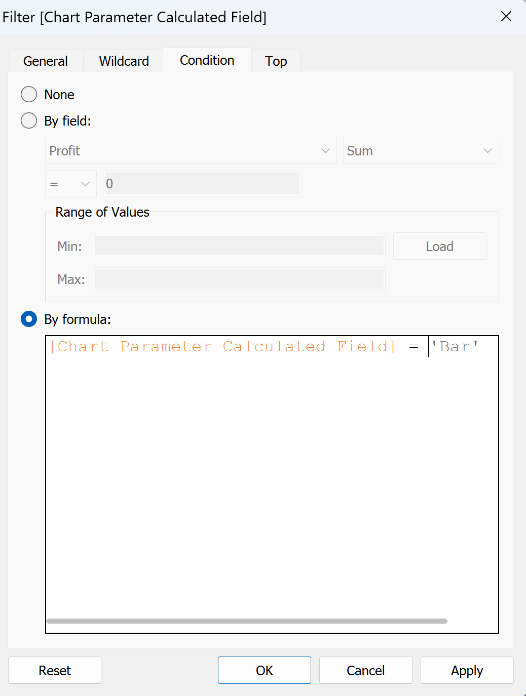 - Drag your new calculated field into the Filters pane of your first chart and click on the condition tab in the window that will appear. Inside here, select 'By Formula:' and write a calculation which states that the calculated field is equal to the name that you gave to the chart that you are currently on. So for example, if you are on your bar chart you would write...
