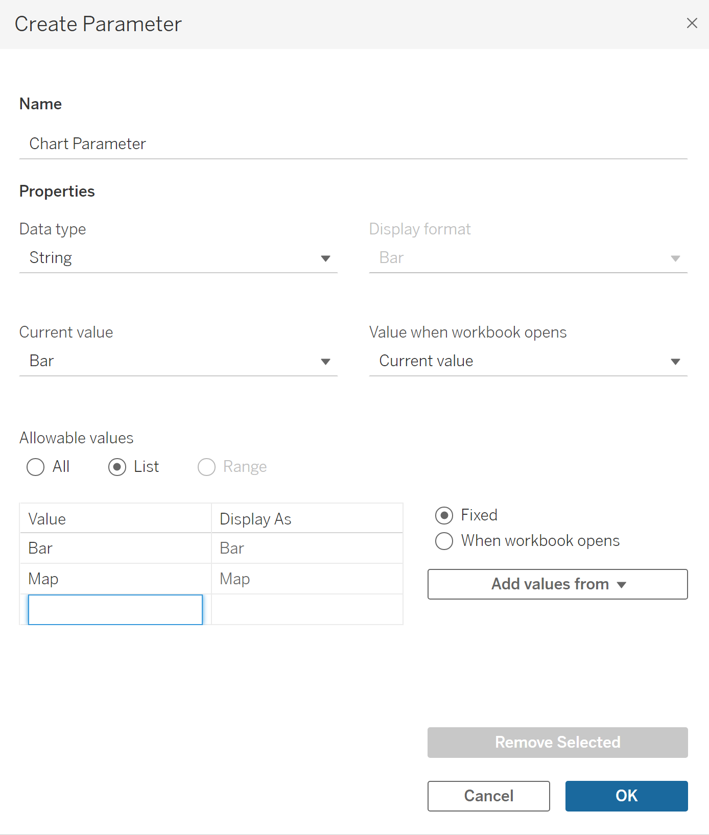 - Under 'Name', type the name of your parameter (maybe something like 'Chart Parameter'), under 'Properties' in 'Data type' choose 'String' and in 'Allowable values' select 'List' and list the names of the charts you want to switch between. You can also then go back into 'Current Value' and choose which chart you want to set as the default.