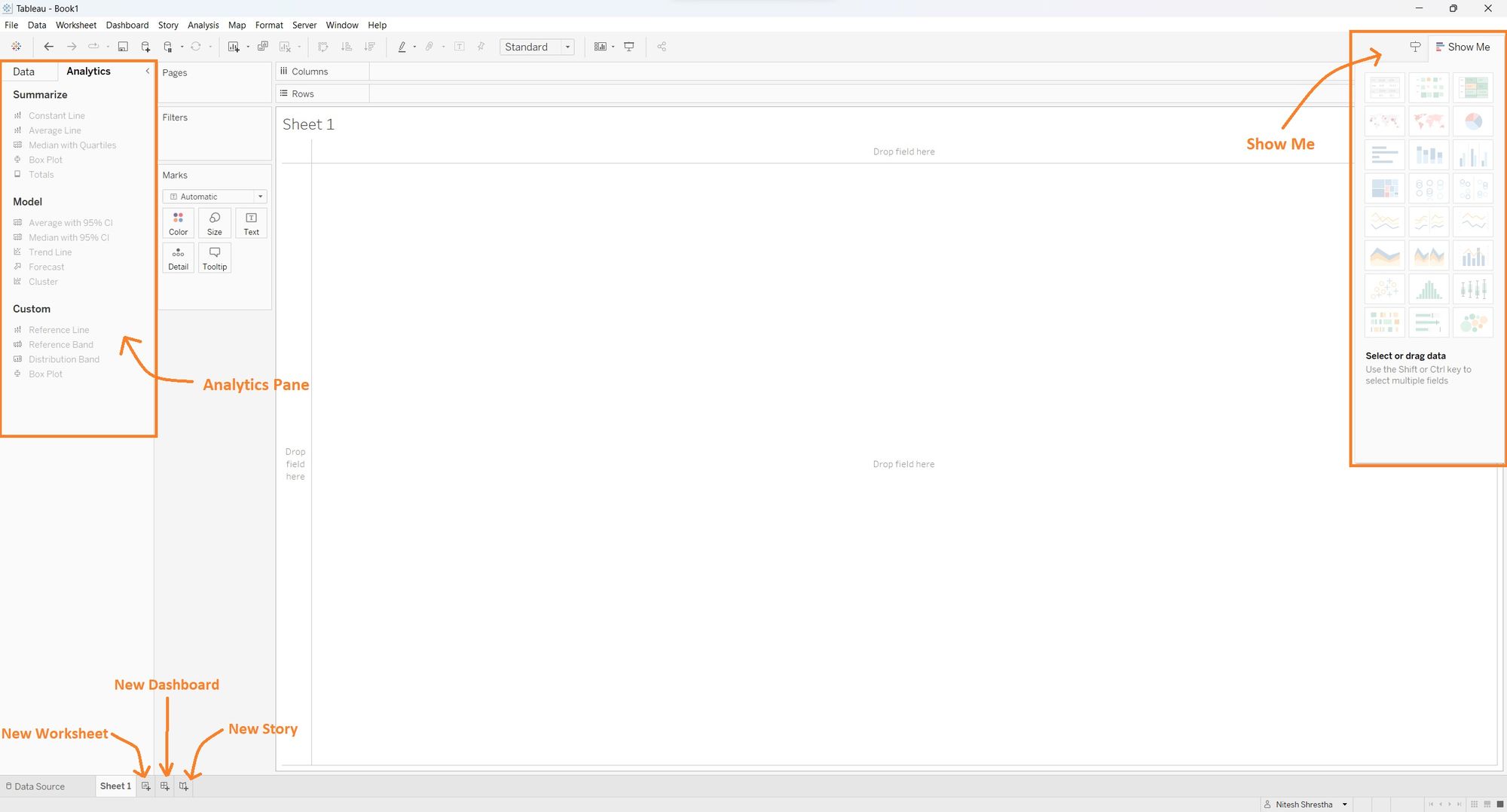 8. Located at the bottom left there are icons with a plus sign you can add new worksheets, dashboards, and story tabs as per your requirement.