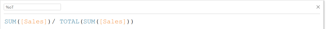 This calculates the contribution of the individual product relative to the entire dataset. TOTAL(SUM([Sales])) allows the calculation to see the grand total of all products in the view, regardless of how the view is filtered later.